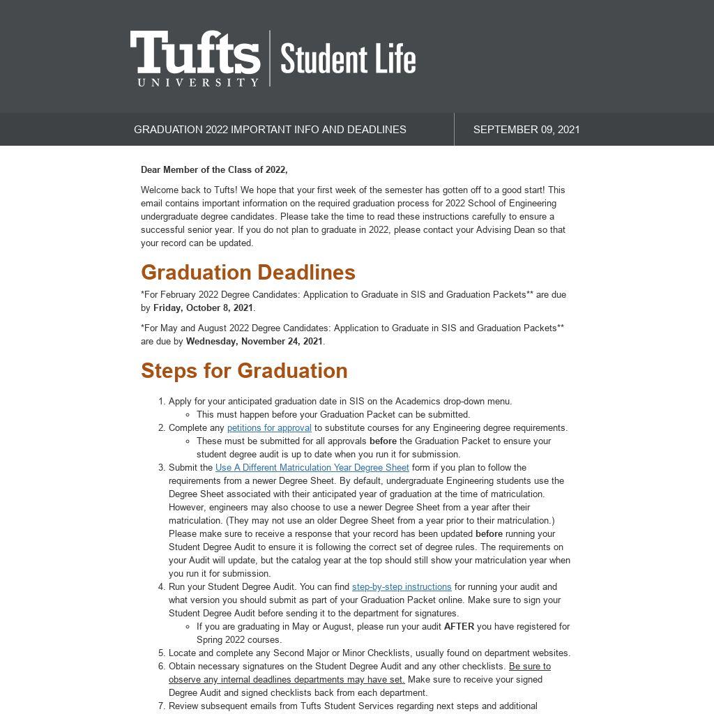 Welcome back to Tufts! We hope that your first week of the semester has gotten off to a good start! This email contains important information on the required graduation process for 2022 School of Engineering undergraduate degree candidates. Please take the time to read these instructions carefully to ensure a successful senior year. If you do not plan to graduate in 2022, please contact your Advising Dean so that your record can be updated.