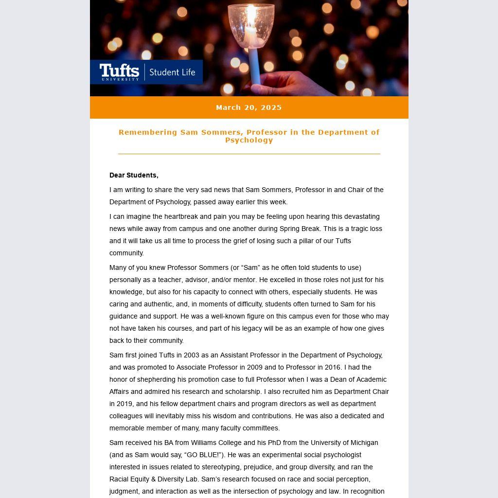 I can imagine the heartbreak and pain you may be feeling upon hearing this devastating news while away from campus and one another during Spring Break. This is a tragic loss and it will take us all time to process the grief of losing such a pillar of our Tufts community.