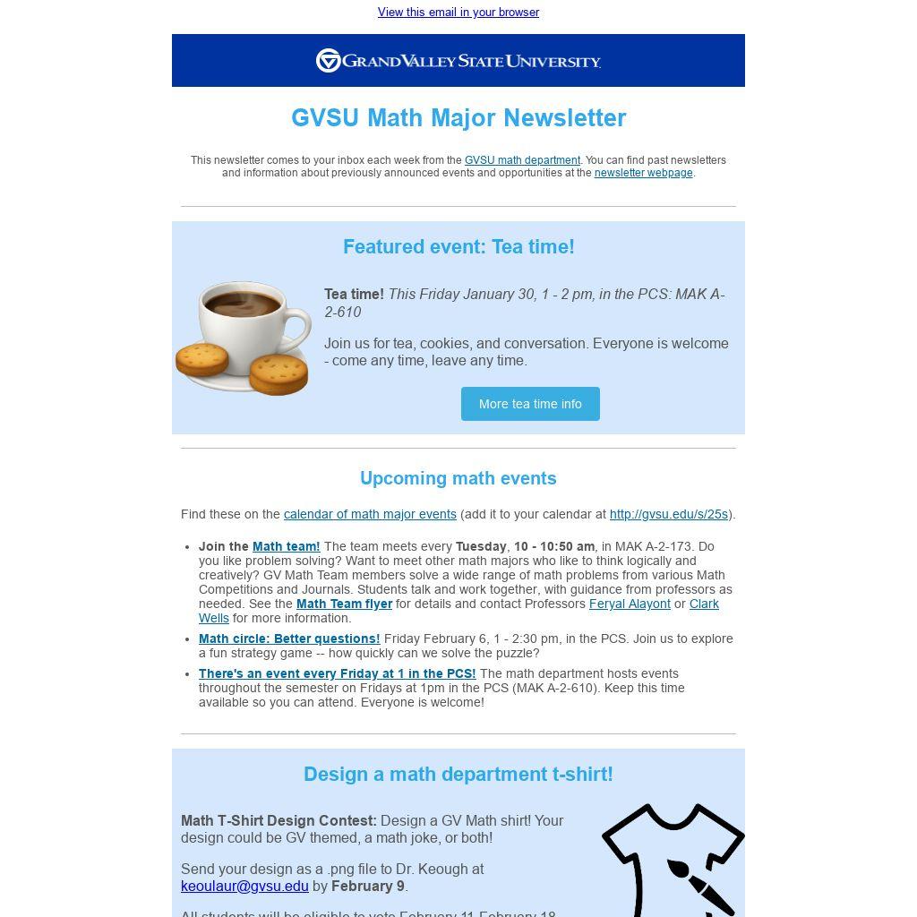 This newsletter comes to your inbox each week from the GVSU math department. You can find past newsletters and information about previously announced events and opportunities at the newsletter webpage.