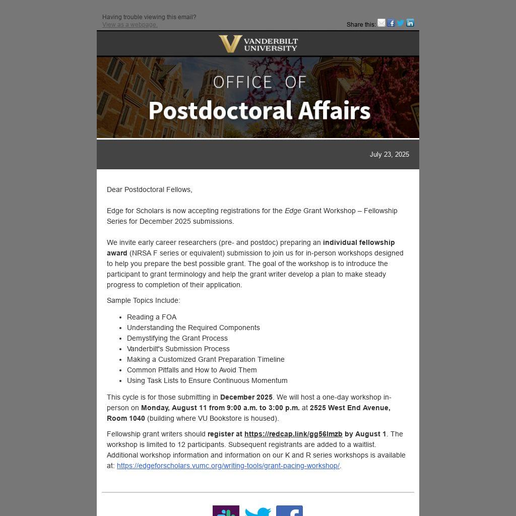 This cycle is for those submitting in December 2025. We will host a one-day workshop in-person on Monday, August 11 from 9:00 a.m. to 3:00 p.m. at 2525 West End Avenue, Room 1040 (building where VU Bookstore is housed).