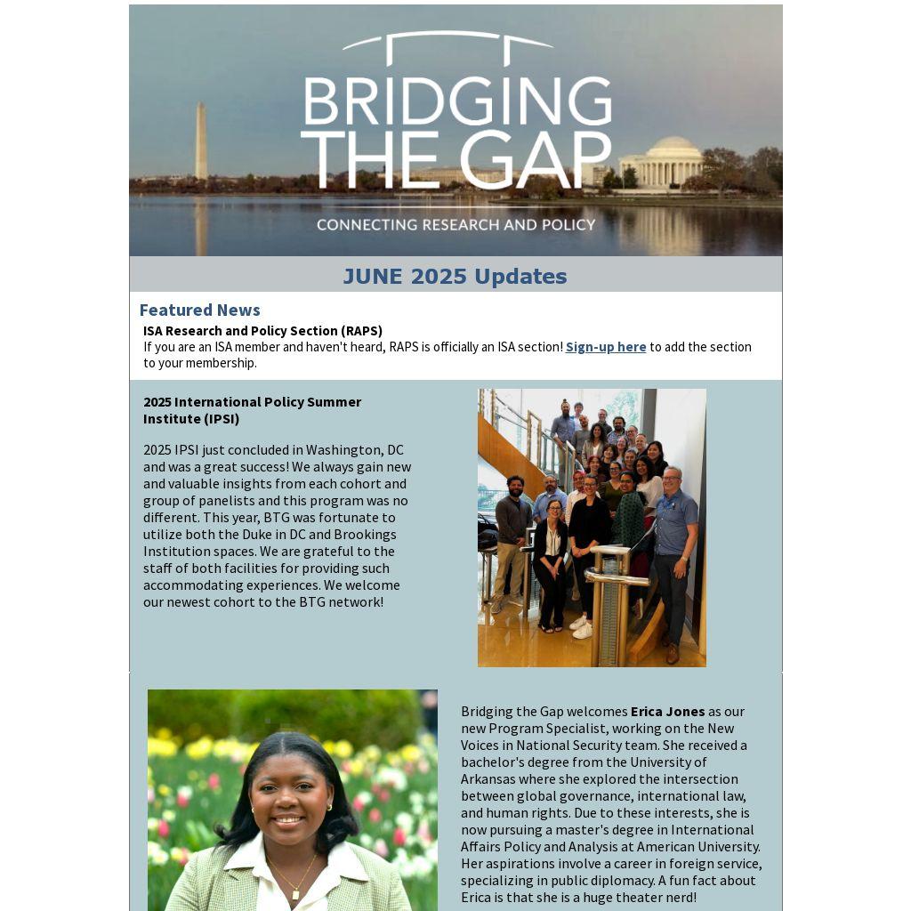 Bridging the Gap welcomes Erica Jones as our new Program Specialist, working on the New Voices in National Security team. She received a bachelor's degree from the University of Arkansas where she explored the intersection between global governance, international law, and human rights. Due to these interests, she is now pursuing a master's degree in International Affairs Policy and Analysis at American University. Her aspirations involve a career in foreign service, specializing in public diplomacy. A fun fact about Erica is that she is a huge theater nerd!