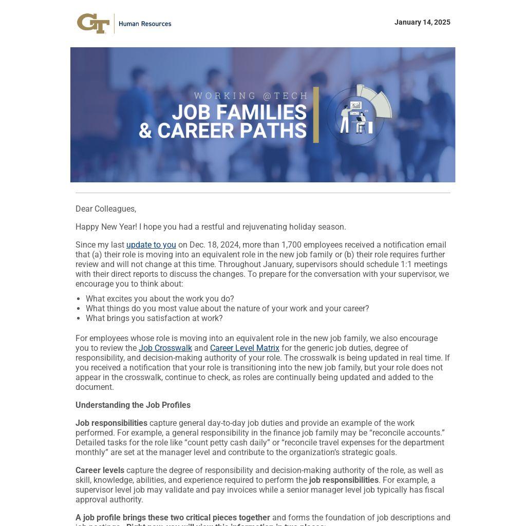 For employees whose role is moving into an equivalent role in the new job family, we also encourage you to review the Job Crosswalk and Career Level Matrix for the generic job duties, degree of responsibility, and decision-making authority of your role. The crosswalk is being updated in real time. If you received a notification that your role is transitioning into the new job family, but your role does not appear in the crosswalk, continue to check, as roles are continually being updated and added to the document.