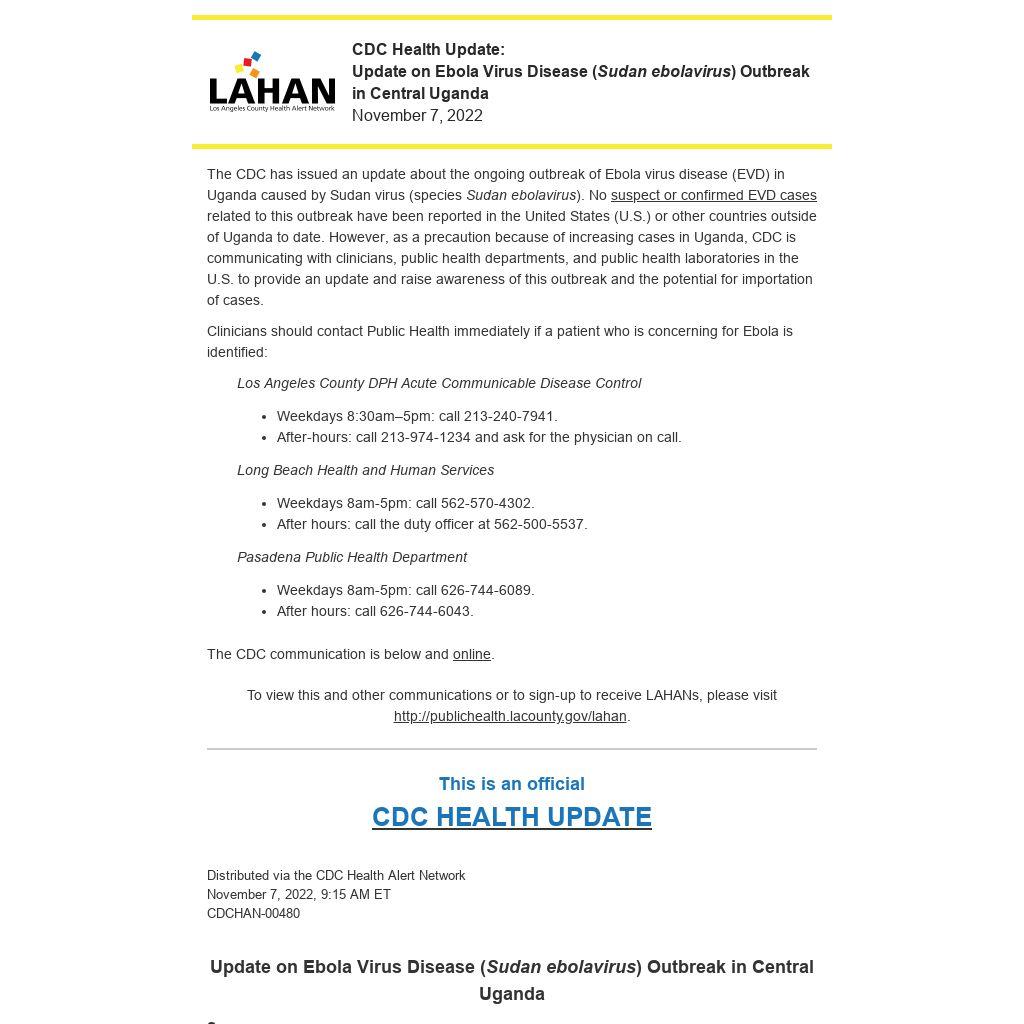 The Centers for Disease Control and Prevention (CDC) is issuing this Health Alert Network (HAN) Health Update as a follow-up to a HAN Health Advisory (Outbreak of Ebola virus disease (Sudan ebolavirus) in Central Uganda) issued on October 6, 2022. This Health Update serves to inform public health departments, public health laboratories, and clinicians in the United States about the ongoing outbreak of Ebola virus disease (EVD) in Uganda caused by Sudan virus (species Sudan ebolavirus). No suspect or confirmed EVD cases related to this outbreak have been reported in the United States (U.S.) or other countries outside of Uganda to date. However, as a precaution because of increasing cases in Uganda, CDC is communicating with public health departments, public health laboratories, and healthcare workers in the United States to provide an update and raise awareness of this outbreak and the potential for importation of cases.