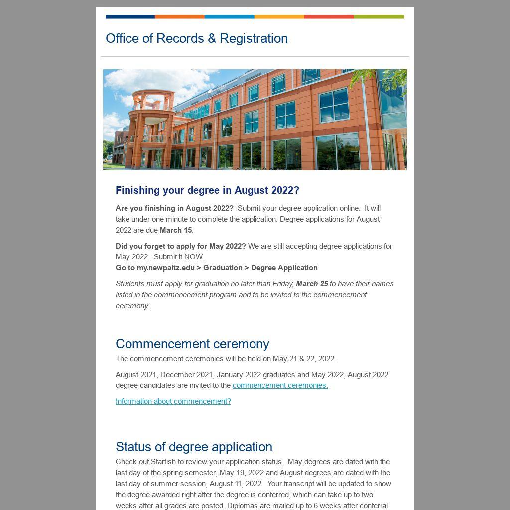 Are you finishing in August 2022? Submit your degree application online. It will take under one minute to complete the application. Degree applications for August 2022 are due March 15.