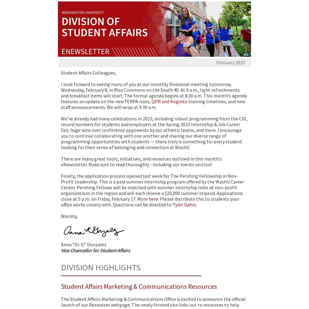 We’ve already had many celebrations in 2023, including robust programming from the CDI, record numbers for students and employers at the Spring 2023 Internship & Job Career Fair, huge wins over conference opponents by our athletic teams, and more. I encourage you to continue collaborating with one another and sharing our diverse range of programming opportunities with students — there truly is something for every student looking for their sense of belonging and connection at WashU.