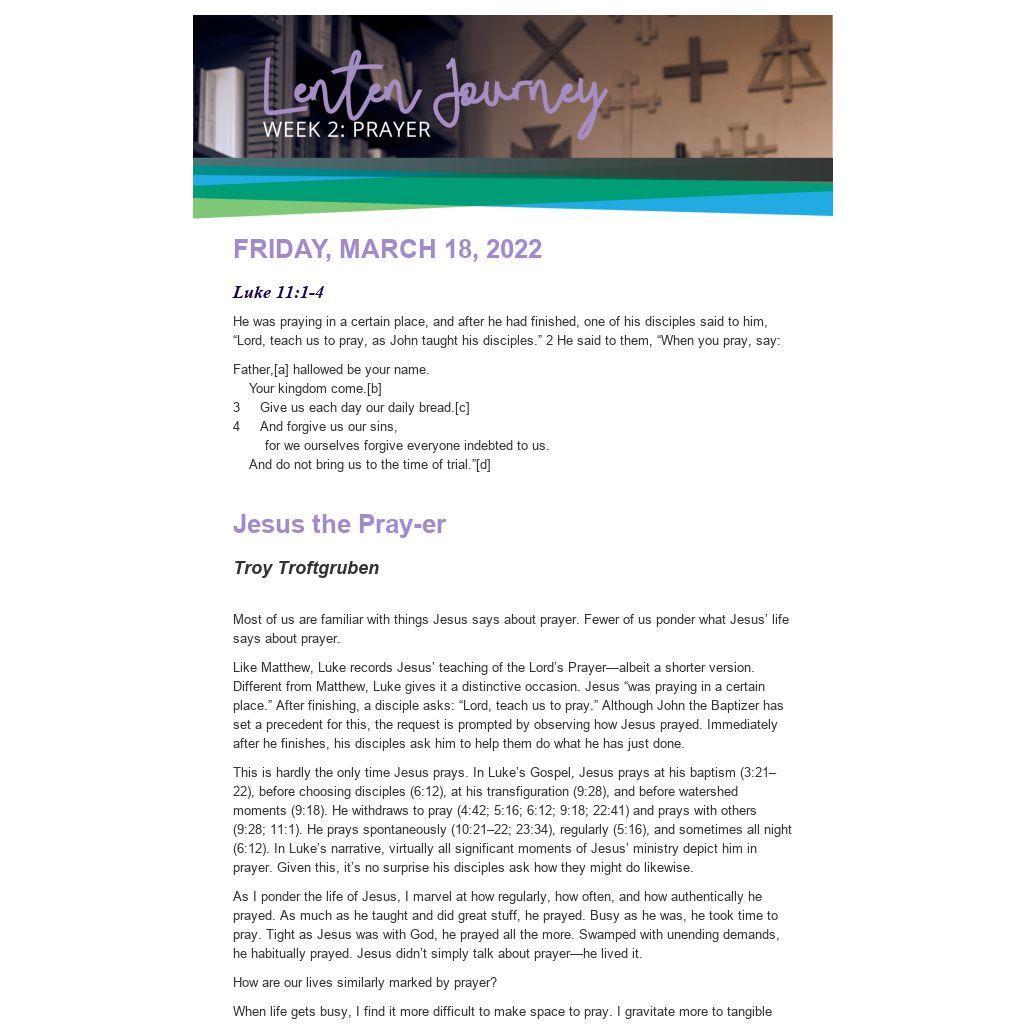Like Matthew, Luke records Jesus’ teaching of the Lord’s Prayer—albeit a shorter version. Different from Matthew, Luke gives it a distinctive occasion. Jesus “was praying in a certain place.” After finishing, a disciple asks: “Lord, teach us to pray.” Although John the Baptizer has set a precedent for this, the request is prompted by observing how Jesus prayed. Immediately after he finishes, his disciples ask him to help them do what he has just done.