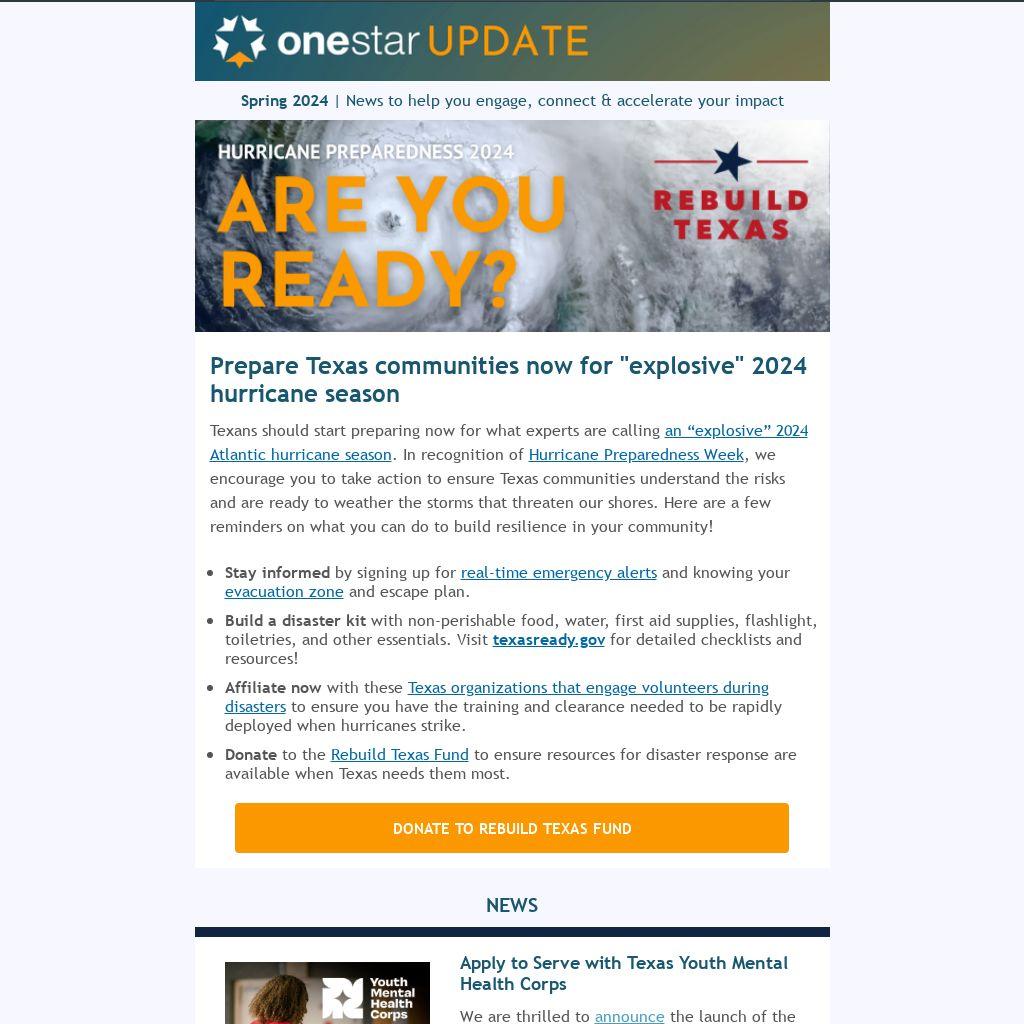 Texans should start preparing now for what experts are calling an “explosive” 2024 Atlantic hurricane season. In recognition of Hurricane Preparedness Week, we encourage you to take action to ensure Texas communities understand the risks and are ready to weather the storms that threaten our shores. Here are a few reminders on what you can do to build resilience in your community!