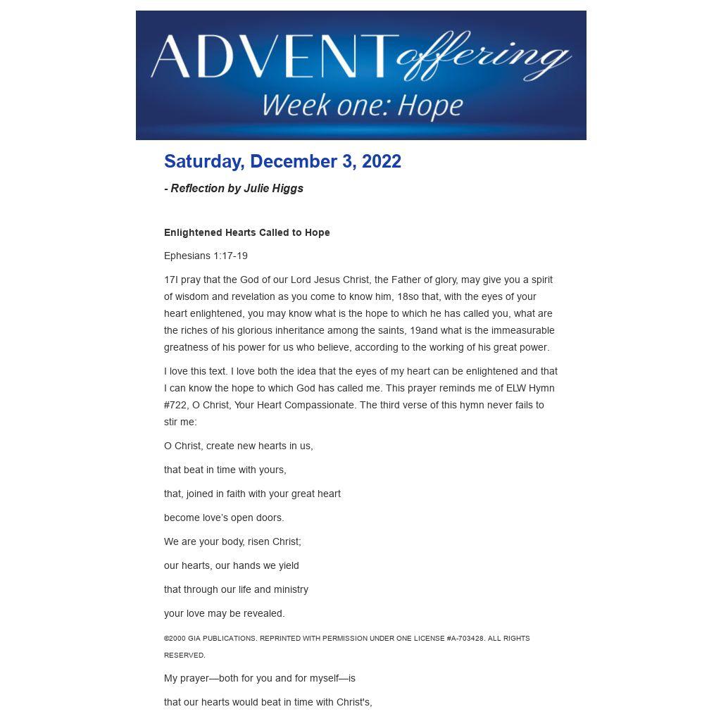 I love this text. I love both the idea that the eyes of my heart can be enlightened and that I can know the hope to which God has called me. This prayer reminds me of ELW Hymn #722, O Christ, Your Heart Compassionate. The third verse of this hymn never fails to stir me: