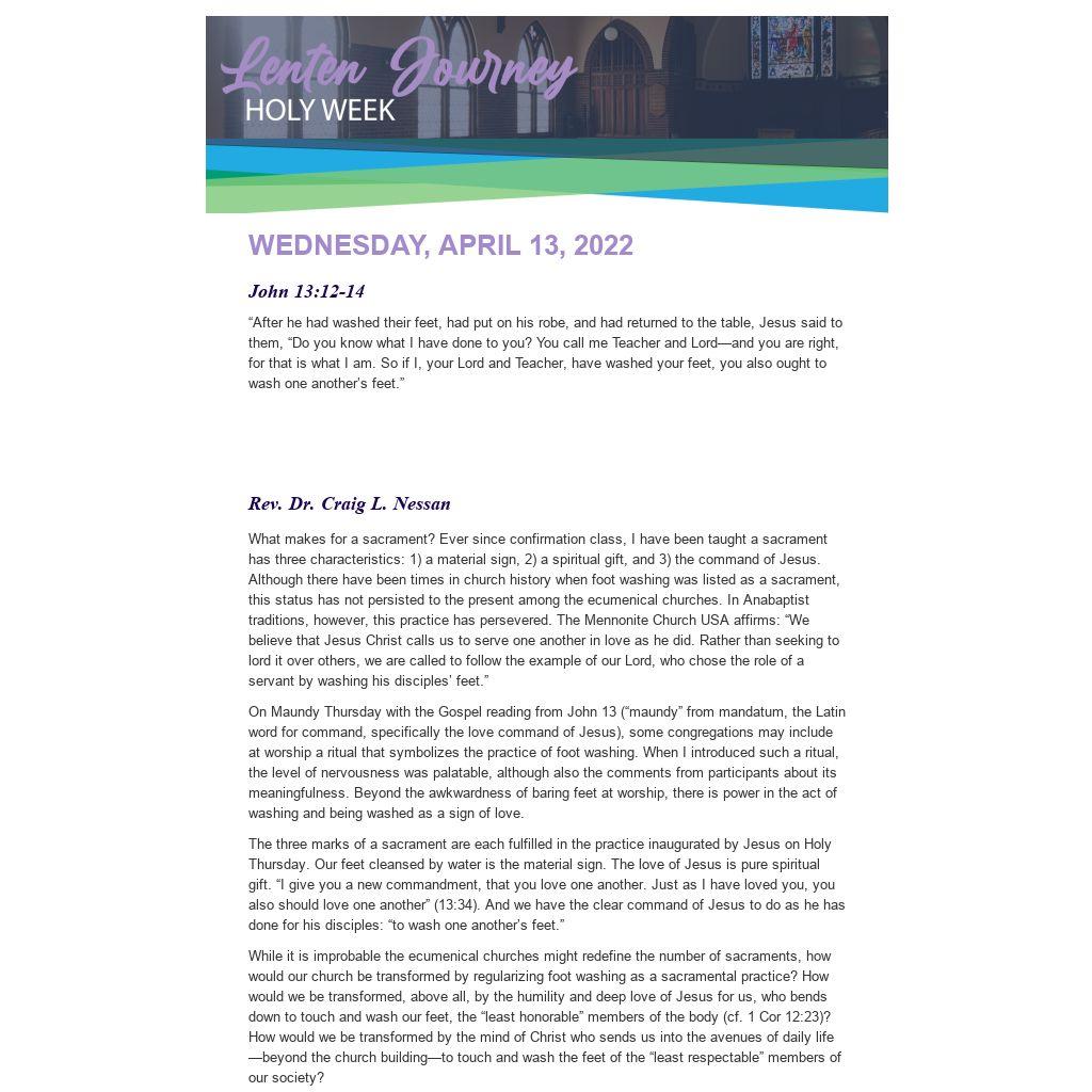 Foot washing—as the sacrament of neighbor love in your family, neighborhood, local community, workplace, school, and among the crucified people of our world—could transform our church from its consumer mentality toward discovering anew that Jesus still meets us in the least of these (Matt 25:40). As we enter the liminal space of Maundy Thursday, let us receive as our own the love of Jesus mediated through washing the feet of disciples. And let us be enveloped by that selfsame love as we turn in humility to wash the feet of the neighbors Christ gives us to serve each new day.