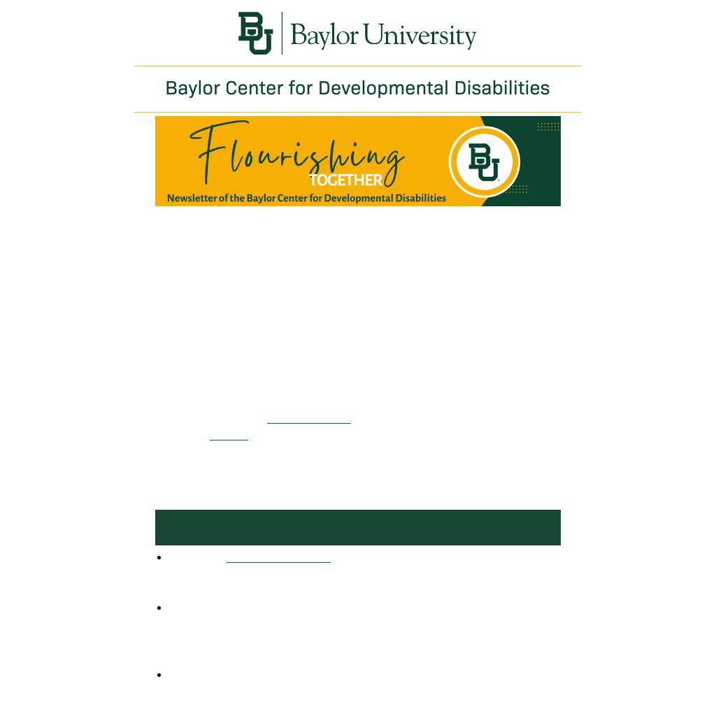 Welcome to the April issue of Flourishing Together, the newsletter of the Baylor Center for Developmental Disabilities. We are excited to celebrate Autism Acceptance Month with you. As you may know, “Autism Awareness Month" became "Autism Acceptance Month” in 2021. This shift in language reframed the focus toward embracing differences recognizing diverse experiences and perspectives and fostering support, inclusion, and belonging for autistic individuals. This month, we aim to honor and celebrate the lives of autistic individuals in our local, state, and national communities. We will feature several stories that highlight the experiences of autistic individuals, as well as impactful research and programming in the area of autism at Baylor and beyond. We hope you will join us at our upcoming events and stay connected through our social media and website. At the Center, we are continuously growing our interdisciplinary work and invite you to collaborate on research, training, programming, and community outreach.