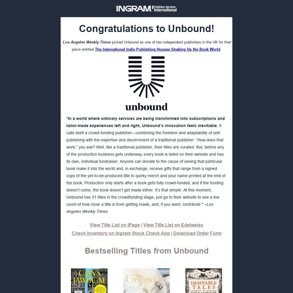 "In a world where ordinary services are being transformed into subscriptions and tailor-made experiences left and right, Unbound’s innovation feels inevitable. It calls itself a crowd-funding publisher—combining the freedom and adaptability of self-publishing with the expertise and discernment of a traditional publisher. “How does that work,” you ask? Well, like a traditional publisher, their titles are curated. But, before any of the production business gets underway, every book is listed on their website and has its own, individual fundraiser. Anyone can donate to the cause of seeing that particular book make it into the world and, in exchange, receive gifts that range from a signed copy of the yet-to-be-produced title to quirky merch and your name printed at the end of the book. Production only starts after a book gets fully crowd-funded, and if the funding doesn’t come, the book doesn’t get made either. It’s that simple. At this moment, Unbound has 31 titles in the crowdfunding stage, just go to their website to see a live count of how close a title is from getting made, and, if you want, contribute." –Los Angeles Weekly Times