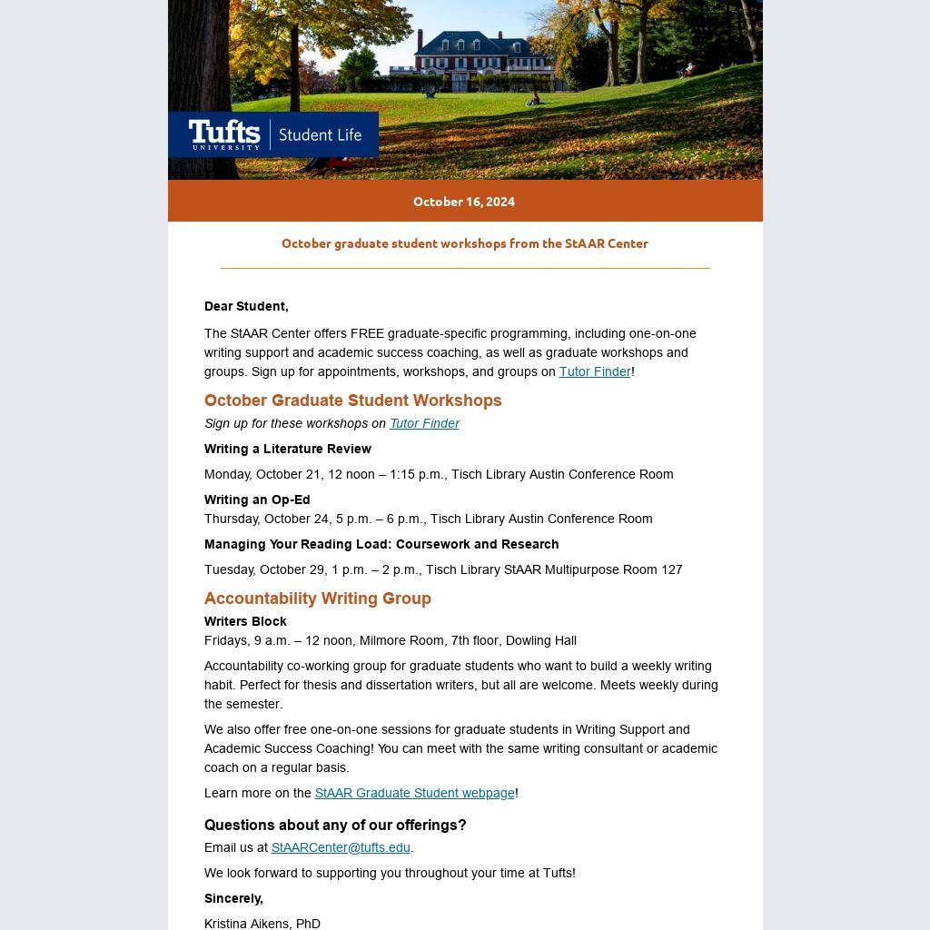 The StAAR Center offers FREE graduate-specific programming, including one-on-one writing support and academic success coaching, as well as graduate workshops and groups. Sign up for appointments, workshops, and groups on Tutor Finder!