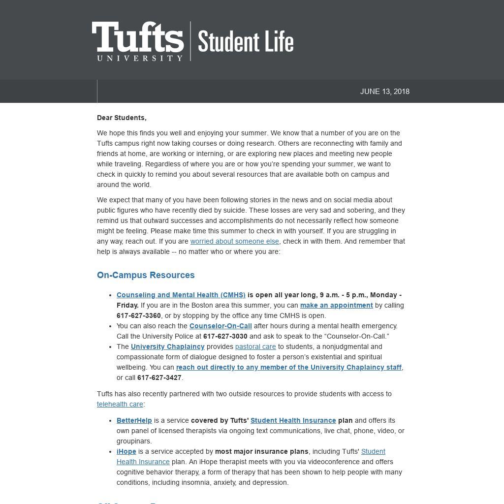 We expect that many of you have been following stories in the news and on social media about public figures who have recently died by suicide. These losses are very sad and sobering, and they remind us that outward successes and accomplishments do not necessarily reflect how someone might be feeling. Please make time this summer to check in with yourself. If you are struggling in any way, reach out. If you are worried about someone else, check in with them. And remember that help is always available -- no matter who or where you are: On-Campus Resources