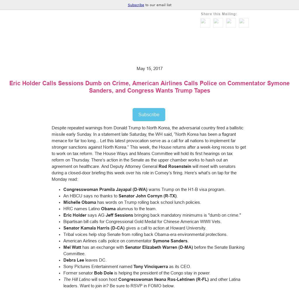 Despite repeated warnings from Donald Trump to North Korea, the adversarial country fired a ballistic missile early Sunday. In a statement late Saturday, the WH said, “North Korea has been a flagrant menace for far too long... Let this latest provocation serve as a call for all nations to implement far stronger sanctions against North Korea.” This week, the House returns after a week-long recess to get to work on tax reform. The House Ways and Means Committee will hold its first hearings on tax reform on Thursday. There’s action in the Senate as the upper chamber works to hash out an agreement on healthcare. And Deputy Attorney General Rod Rosenstein will meet with senators during a closed-door briefing this week over his role in Comey’s firing. Here’s what’s on tap for the Monday read:- Congresswoman Pramila Jayapal (D-WA) warns Trump on the H1-B visa program.