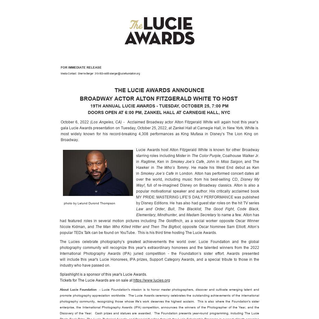 Lucie Awards host Alton Fitzgerald White is known for other Broadway starring roles including Mister in The Color Purple, Coalhouse Walker Jr. in Ragtime, Ken in Smokey Joe’s Cafe, John in Miss Saigon, and The Hawker in The Who’s Tommy. He made his West End debut as Ken in Smokey Joe’s Cafe in London. Alton has performed concert dates all over the world, including music from his best-selling CD, Disney My Way!, full of re-imagined Disney on Broadway classics. Alton is also a popular motivational speaker and author. His critically acclaimed book MY PRIDE: MASTERING LIFE’S DAILY PERFORMANCE was published by Disney Editions. He has also had guest star roles on the hit TV series Law and Order, Bull, The Blacklist, The Good Fight, Code Black, Elementary, Mindhunter, and Madam Secretary to name a few. Alton has had featured roles in several motion pictures including The Goldfinch, as a social worker opposite Oscar Winner Nicole Kidman, and The Man Who Killed Hitler and Then The Bigfoot, opposite Oscar Nominee Sam Elliott. Alton’s popular TEDx Talk can be found on YouTube. This is his third time hosting The Lucie Awards.