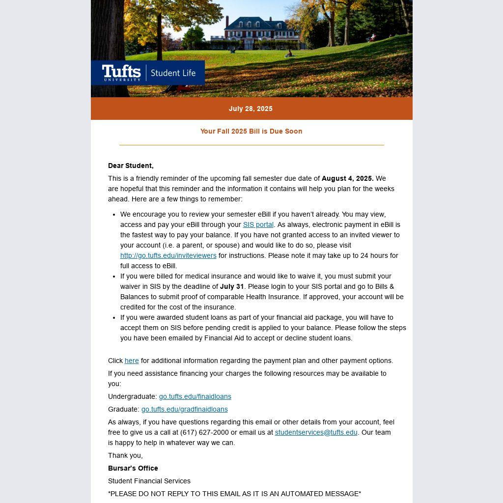 As always, if you have questions regarding this email or other details from your account, feel free to give us a call at (617) 627-2000 or email us at studentservices@tufts.edu. Our team is happy to help in whatever way we can.