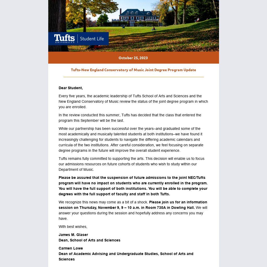 Please be assured that the suspension of future admissions to the joint NEC/Tufts program will have no impact on students who are currently enrolled in the program. You will have the full support of both institutions. You will be able to complete your degrees with the full support of faculty and staff in both Tufts.