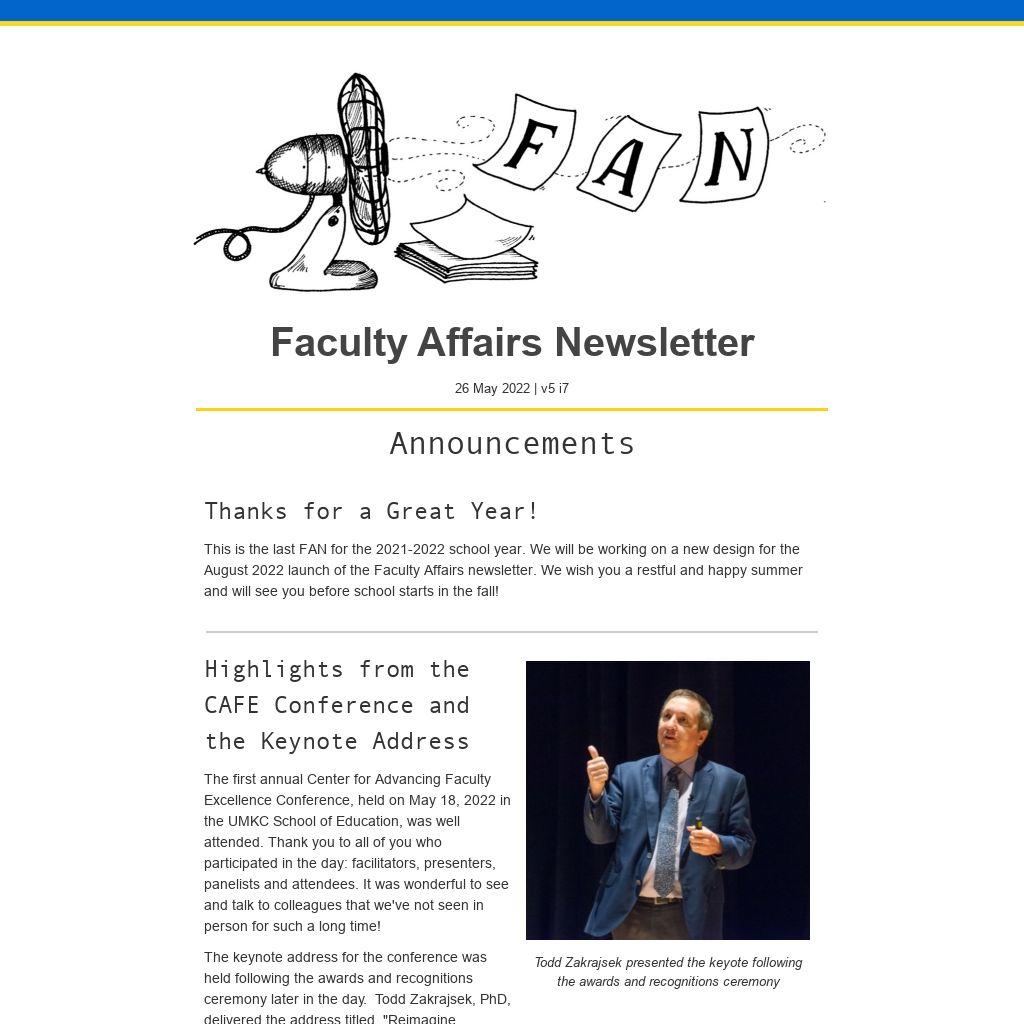 This is the last FAN for the 2021-2022 school year. We will be working on a new design for the August 2022 launch of the Faculty Affairs newsletter. We wish you a restful and happy summer and will see you before school starts in the fall!