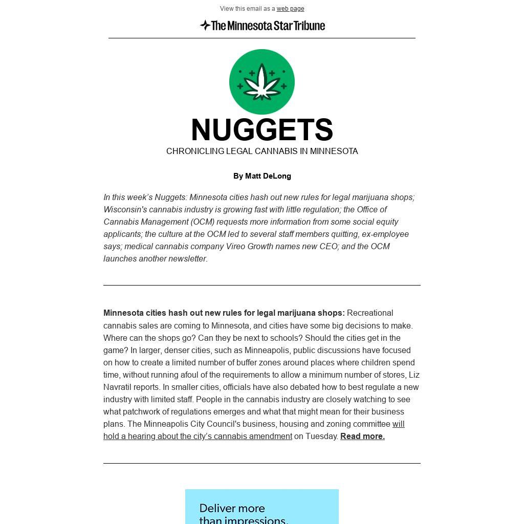 In this week’s Nuggets: Minnesota cities hash out new rules for legal marijuana shops; Wisconsin's cannabis industry is growing fast with little regulation; the Office of Cannabis Management (OCM) requests more information from some social equity applicants; the culture at the OCM led to several staff members quitting, ex-employee says; medical cannabis company Vireo Growth names new CEO; and the OCM launches another newsletter.
