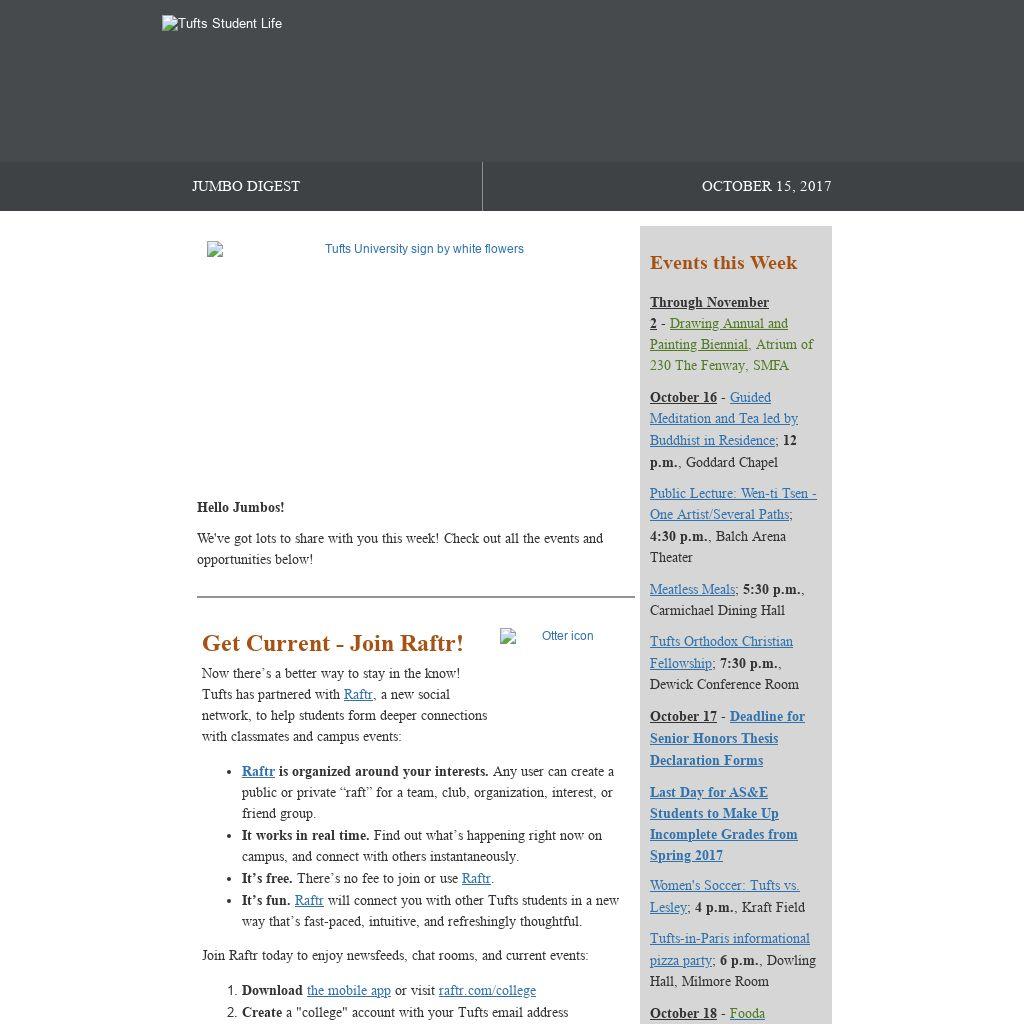 Now there’s a better way to stay in the know! Tufts has partnered with Raftr, a new social network, to help students form deeper connections with classmates and campus events: - Raftr is organized around your interests. Any user can create a public or private “raft” for a team, club, organization, interest, or friend group.