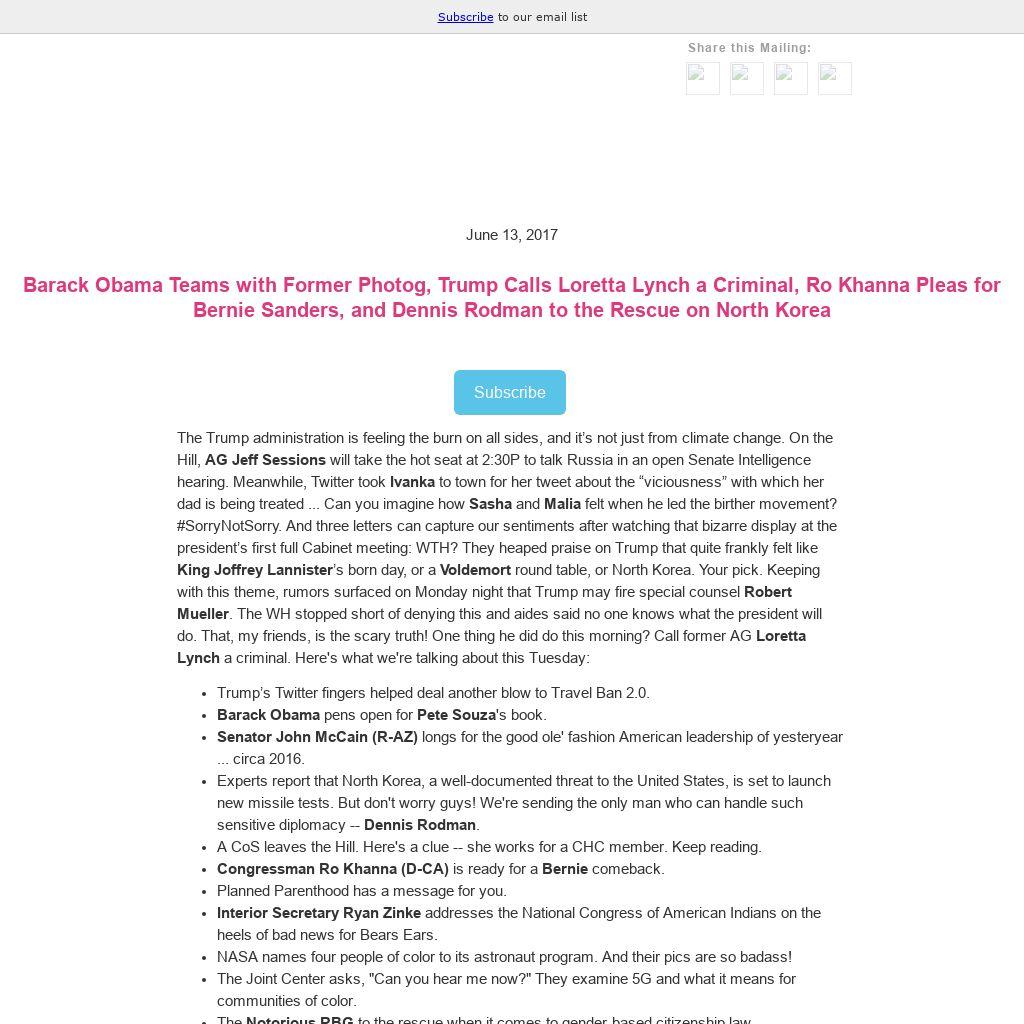 At 5:45 this morning, Donald Trump called former AG Loretta Lynch a criminal. The embattled president tweeted, “A.G. Lynch made law enforcement decisions for political purposes...gave Hillary Clinton a free pass and protection. Totally illegal!” During his testimony to the Senate Intelligence Committee last week, James Comey said that Lynch directed him to adopt the same language as Clinton's presidential campaign in referring to the FBI's email investigation as a "matter." Umm...we guess that’s the same thing as colluding with a foreign adversary. Or violating the Emoluments Clause of the Constitution. Or grabbing women without their permission. Senator Diane Feinstein (D-CA) has stated the Clinton “matter” deserves greater attention. Well, that was music to the president’s ears. More here.