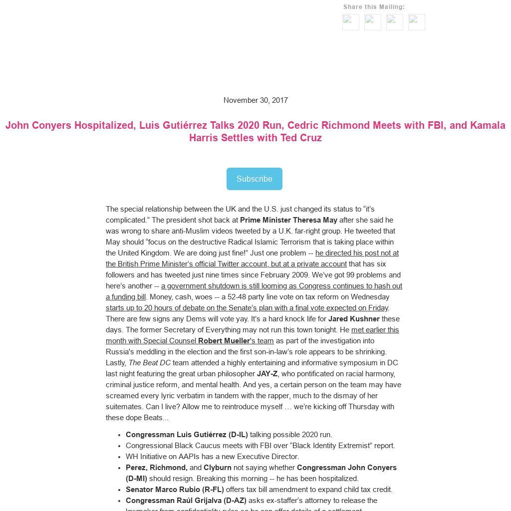 - Perez, Richmond, and Clyburn not saying whether Congressman John Conyers (D-MI) should resign. Breaking this morning -- he has been hospitalized.