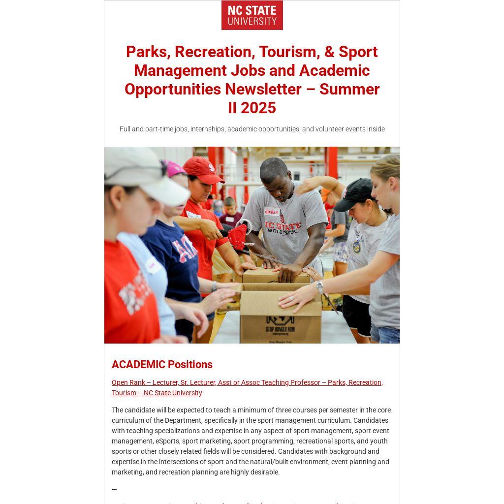 Parks, Recreation, Tourism, & Sport Management Jobs and Academic Opportunities Newsletter – Summer II 2025