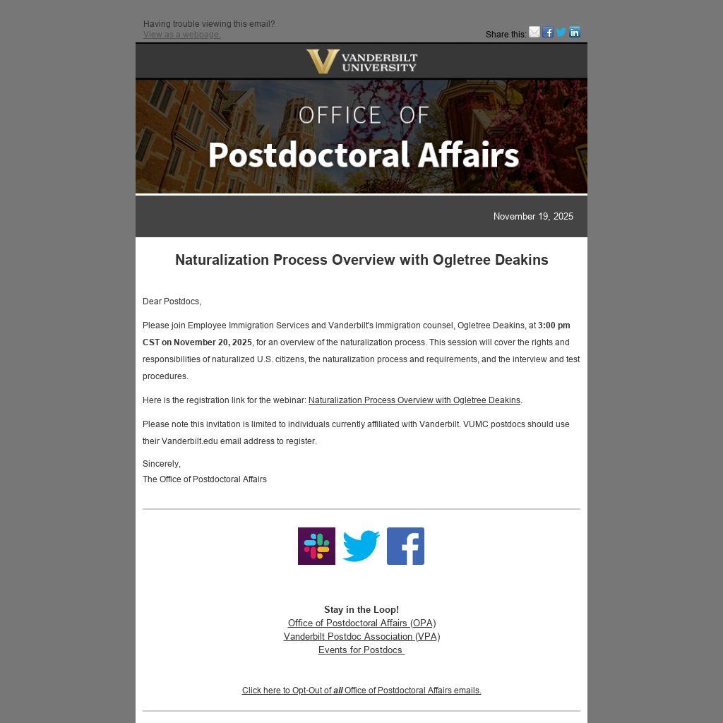 Please join Employee Immigration Services and Vanderbilt's immigration counsel, Ogletree Deakins, at 3:00 pm CST on November 20, 2025, for an overview of the naturalization process. This session will cover the rights and responsibilities of naturalized U.S. citizens, the naturalization process and requirements, and the interview and test procedures.