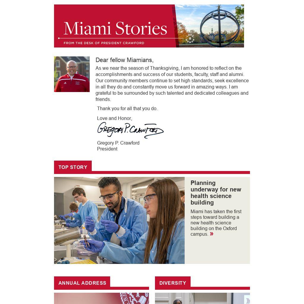As we near the season of Thanksgiving, I am honored to reflect on the accomplishments and success of our students, faculty, staff and alumni. Our community members continue to set high standards, seek excellence in all they do and constantly move us forward in amazing ways. I am grateful to be surrounded by such talented and dedicated colleagues and friends.