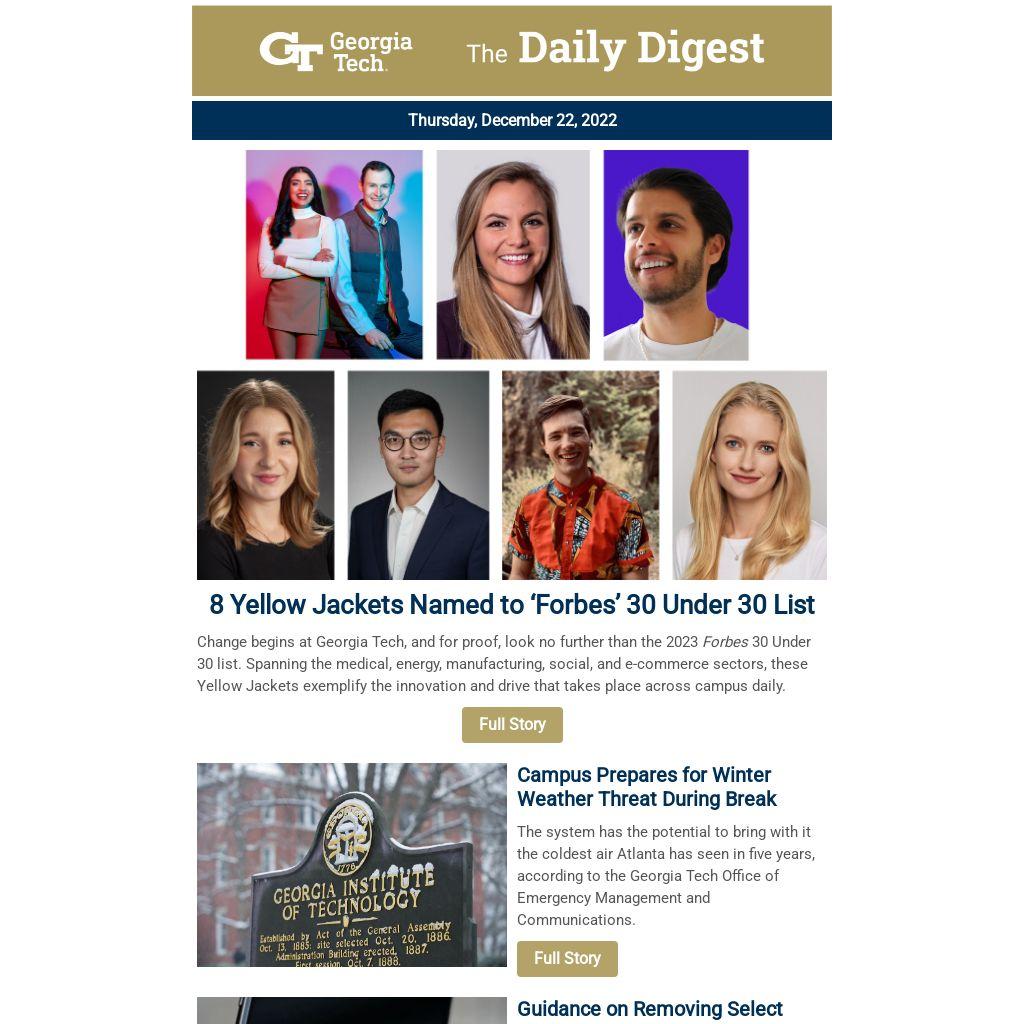 Change begins at Georgia Tech, and for proof, look no further than the 2023 Forbes 30 Under 30 list. Spanning the medical, energy, manufacturing, social, and e-commerce sectors, these Yellow Jackets exemplify the innovation and drive that takes place across campus daily.