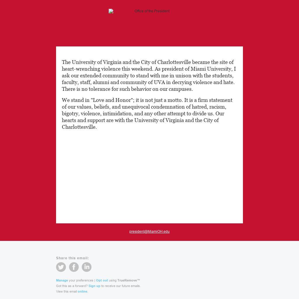 The University of Virginia and the City of Charlottesville became the site of heart-wrenching violence this weekend. As president of Miami University, I ask our extended community to stand with me in unison with the students, faculty, staff, alumni and community of UVA in decrying violence and hate. There is no tolerance for such behavior on our campuses.