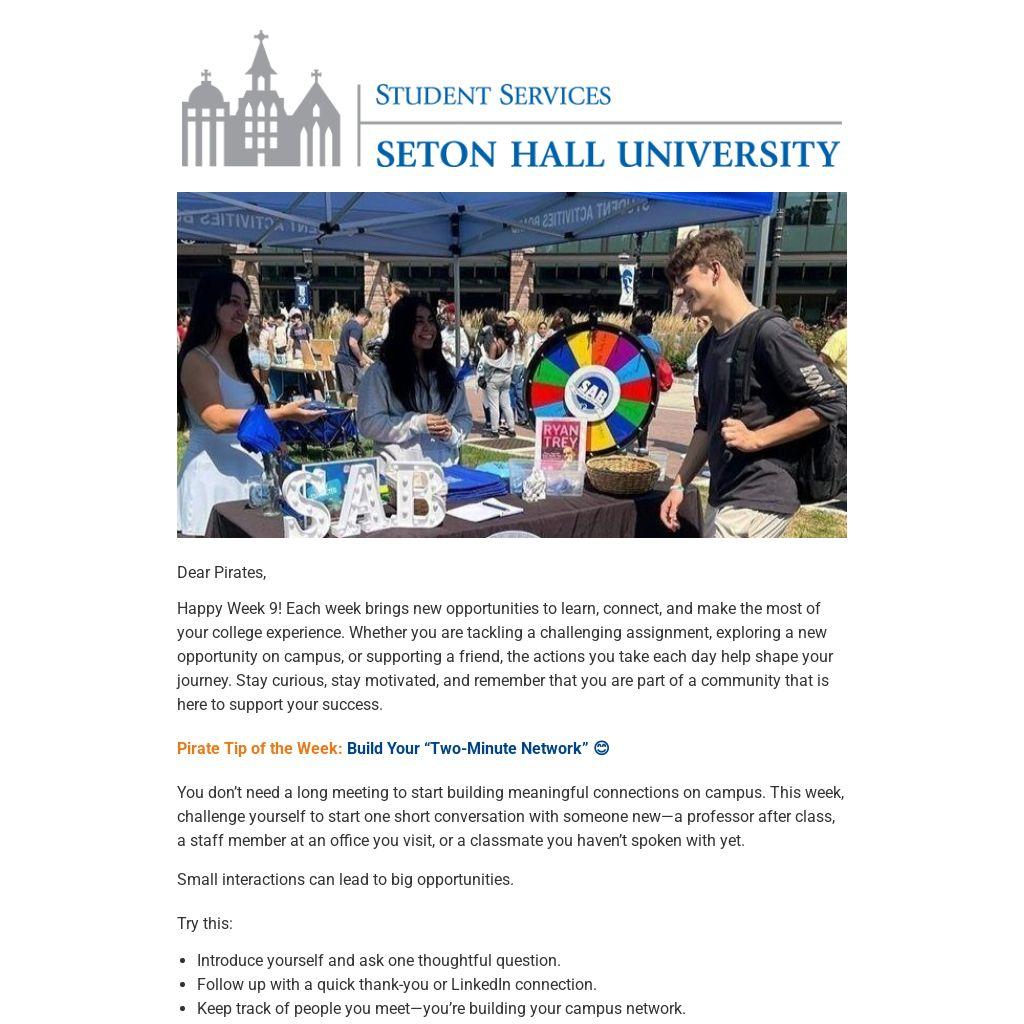 You donât need a long meeting to start building meaningful connections on campus. This week, challenge yourself to start one short conversation with someone newâa professor after class, a staff member at an office you visit, or a classmate you havenât spoken with yet.
