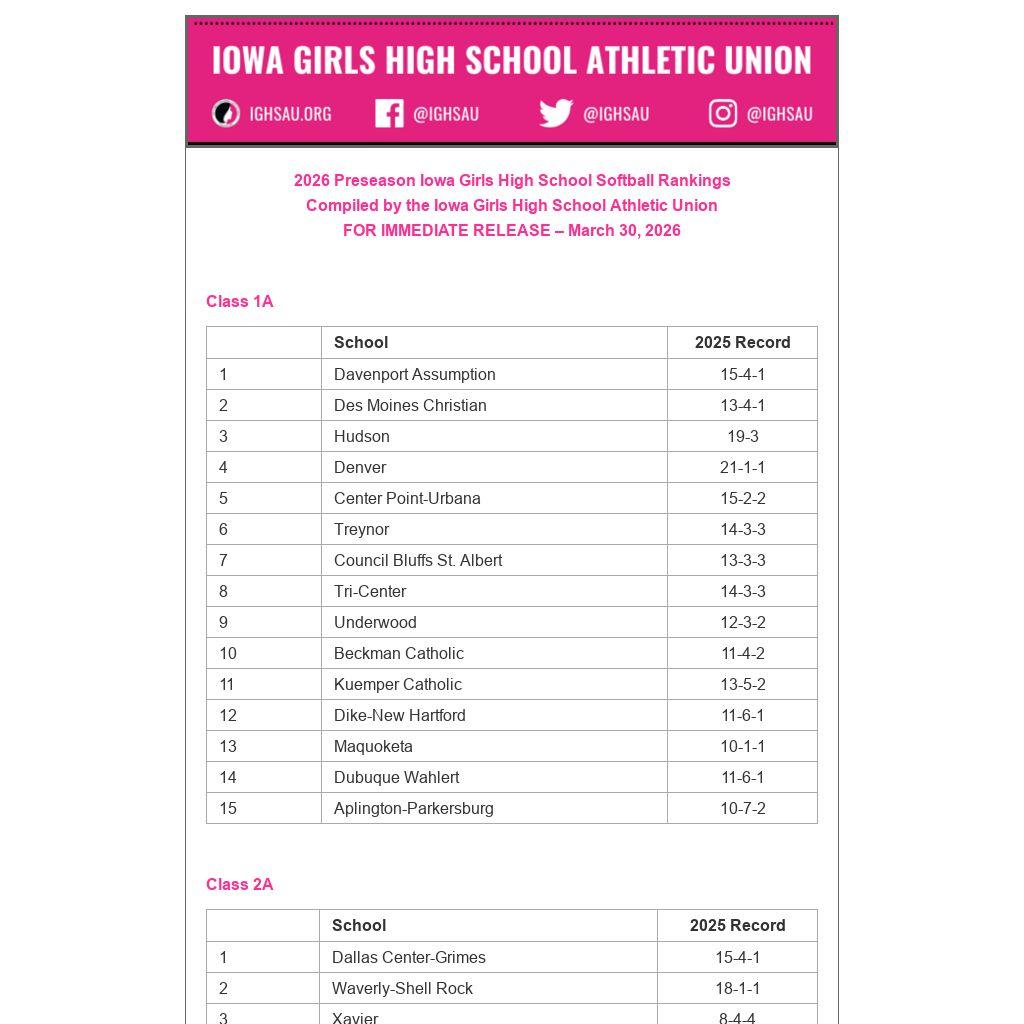 2026 Preseason Iowa Girls High School Softball Rankings