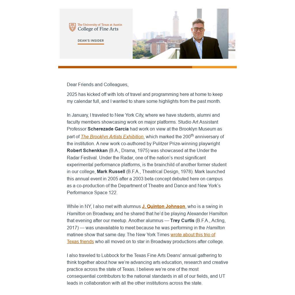 I also traveled to Lubbock for the Texas Fine Arts Deans' annual gathering to think together about how we’re advancing arts education, research and creative practice across the state of Texas. I believe we’re one of the most consequential contributors to the national standards in all of our fields, and UT leads in collaboration with all the other institutions across the state.