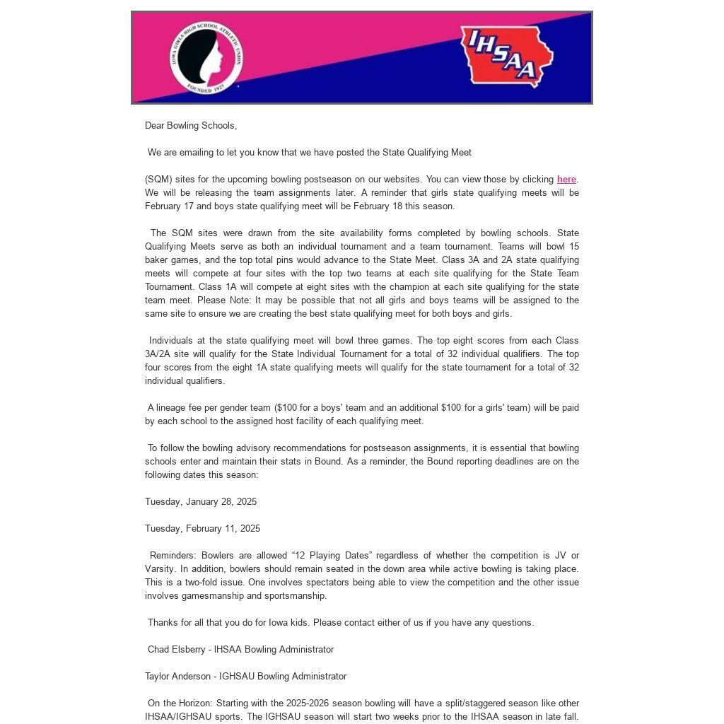 On the Horizon: Starting with the 2025-2026 season bowling will have a split/staggered season like other IHSAA/IGHSAU sports. The IGHSAU season will start two weeks prior to the IHSAA season in late fall. This will result in both the State Qualifying Meets (SQMs) and State Tournaments being separate for girls/boys in 2025-2026.