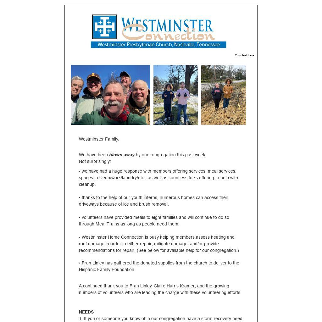 If Westminster church members need help assessing storm damage issues, please reach out to a pastor or Fran at fran.linley@gmail.com so that we can contact Westminster Home Connection directly to help. Westminster Home Connection has six full-time construction employees and can deploy three construction teams at a time. This is a huge gift to our congregation. (Westminster Home Connection is working with Nashville VOAD to help with plumbing repair request needs all throughout the city. It is such a gift that they have offered their broader services to the WPC community and those within the concern of the church.)
