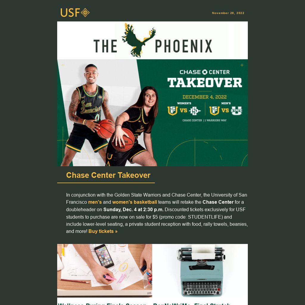 The Phoenix is a weekly e-newsletter sent by Student Leadership and Engagement to help students stay connected and get involved. It features campus events, leadership opportunities, athletic games, workshops, retreats, and more. Why “The Phoenix” title? The Phoenix has long been associated with the history and growth of USF as well as St. Ignatius, who encouraged followers to “go forth and set the world on fire.” Learn more »
