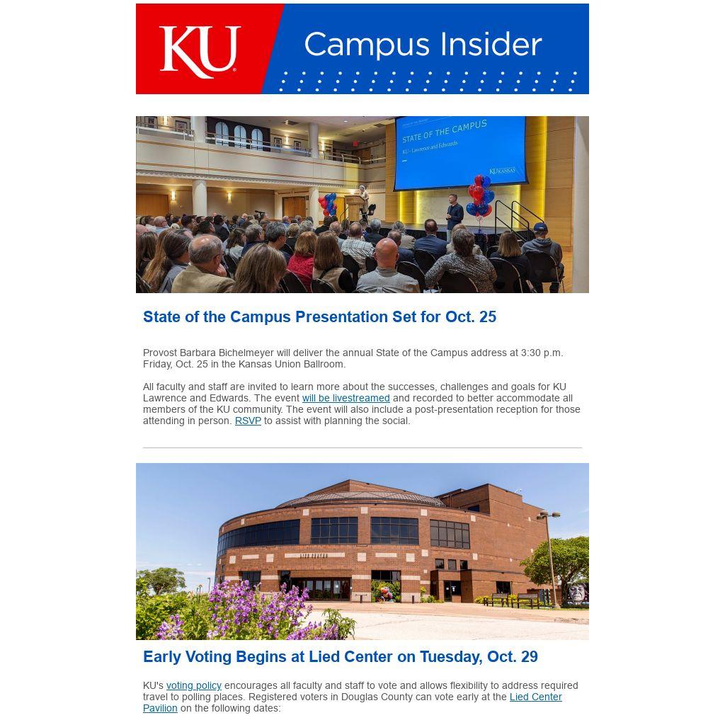 KU's voting policy encourages all faculty and staff to vote and allows flexibility to address required travel to polling places. Registered voters in Douglas County can vote early at the Lied Center Pavilion on the following dates: