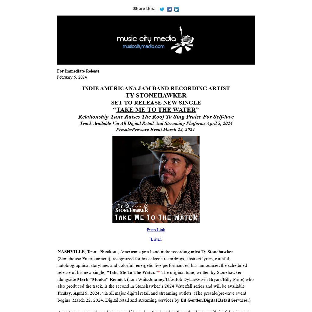 NASHVILLE, Tenn - Breakout, Americana jam band indie recording artist Ty Stonehawker (Stonehouse Entertainment), recognized for his eclectic recordings, abstract lyrics, truthful, autobiographical storylines and colorful, energetic live performances, has announced the scheduled release of his new single, "Take Me To The Water."* The original tune, written by Stonehawker alongside Mark “Mooka'' Rennick (Tom Waits/Journey/Ufo/Bob Dylan/Gavin Bryars/Billy Prine) who also produced the track, is the second in Stonehawker’s 2024 Waterfall series and will be available Friday, April 5, 2024, via all major digital retail and streaming outlets. (The presale/pre-save event begins March 22, 2024. Digital retail and streaming services by Ed Gertler/Digital Retail Services.)