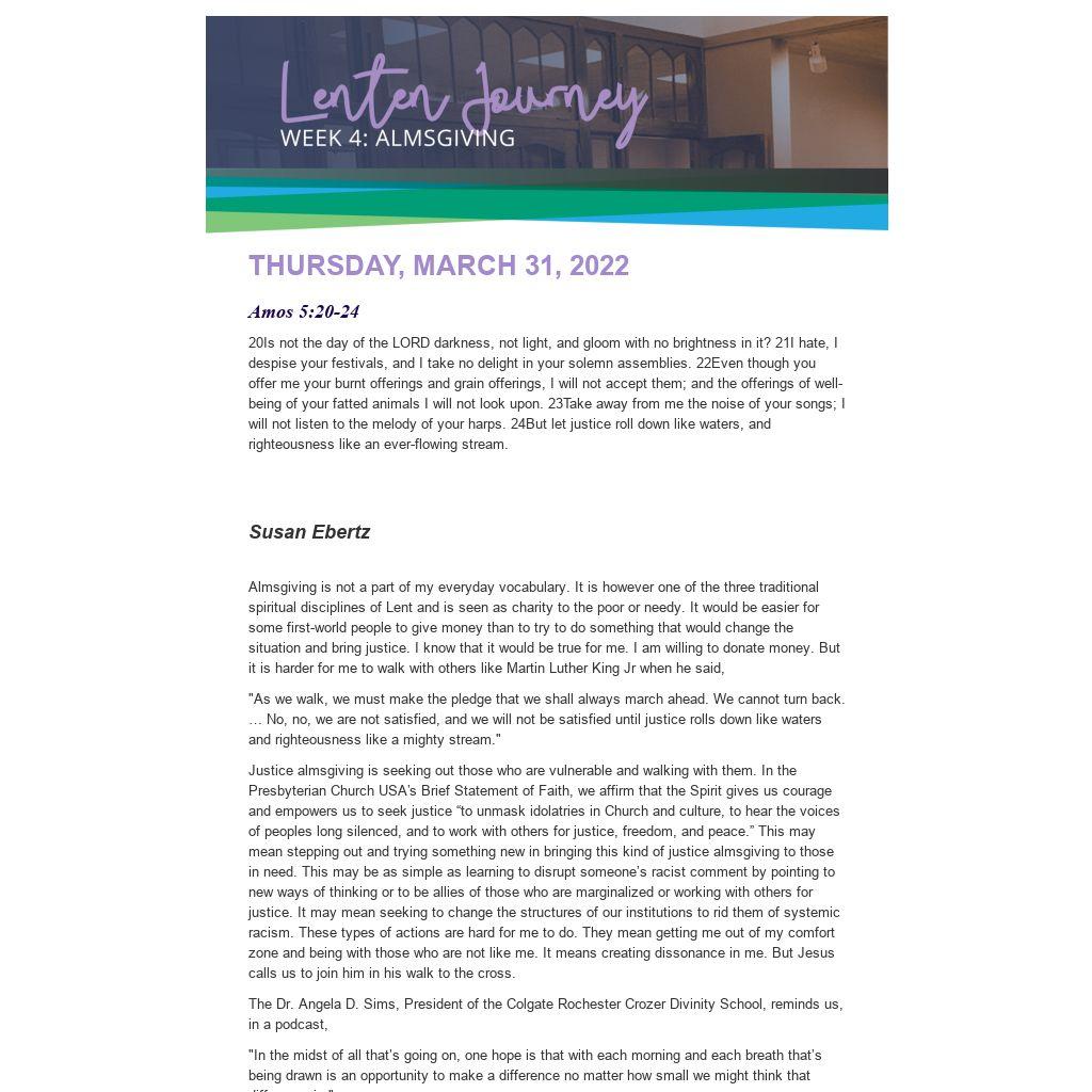 Justice almsgiving is seeking out those who are vulnerable and walking with them. In the Presbyterian Church USA’s Brief Statement of Faith, we affirm that the Spirit gives us courage and empowers us to seek justice “to unmask idolatries in Church and culture, to hear the voices of peoples long silenced, and to work with others for justice, freedom, and peace.” This may mean stepping out and trying something new in bringing this kind of justice almsgiving to those in need. This may be as simple as learning to disrupt someone’s racist comment by pointing to new ways of thinking or to be allies of those who are marginalized or working with others for justice. It may mean seeking to change the structures of our institutions to rid them of systemic racism. These types of actions are hard for me to do. They mean getting me out of my comfort zone and being with those who are not like me. It means creating dissonance in me. But Jesus calls us to join him in his walk to the cross.