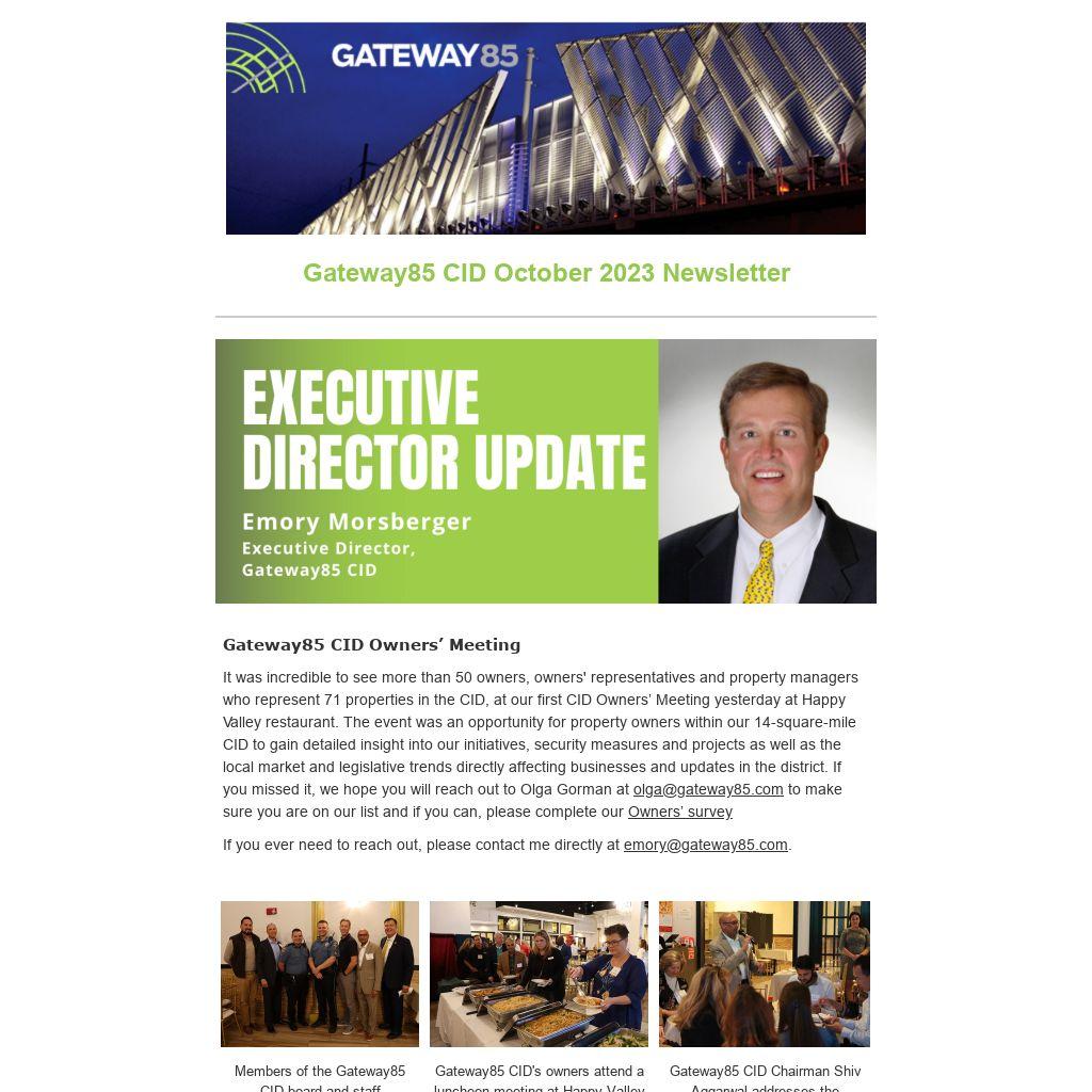 It was incredible to see more than 50 owners, owners' representatives and property managers who represent 71 properties in the CID, at our first CID Owners’ Meeting yesterday at Happy Valley restaurant. The event was an opportunity for property owners within our 14-square-mile CID to gain detailed insight into our initiatives, security measures and projects as well as the local market and legislative trends directly affecting businesses and updates in the district. If you missed it, we hope you will reach out to Olga Gorman at olga@gateway85.com to make sure you are on our list and if you can, please complete our Owners’ survey