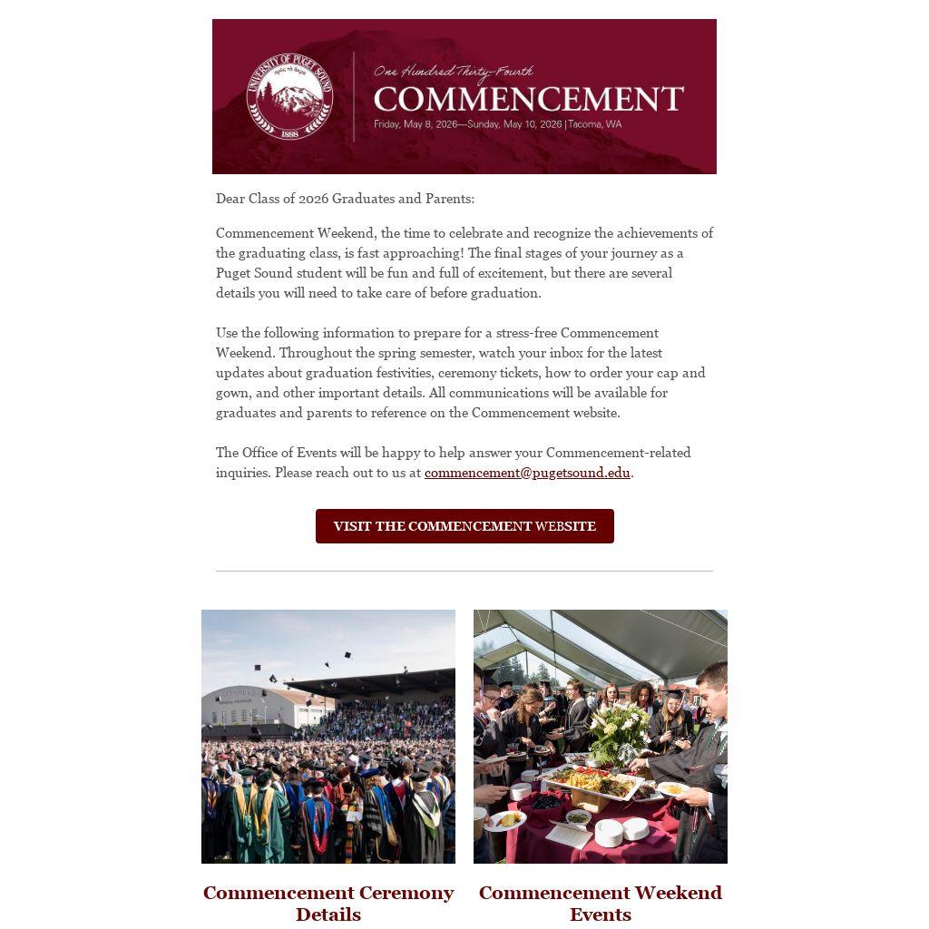 The Office of Events will be happy to help answer your Commencement-related inquiries. Please reach out to us at commencement@pugetsound.edu.