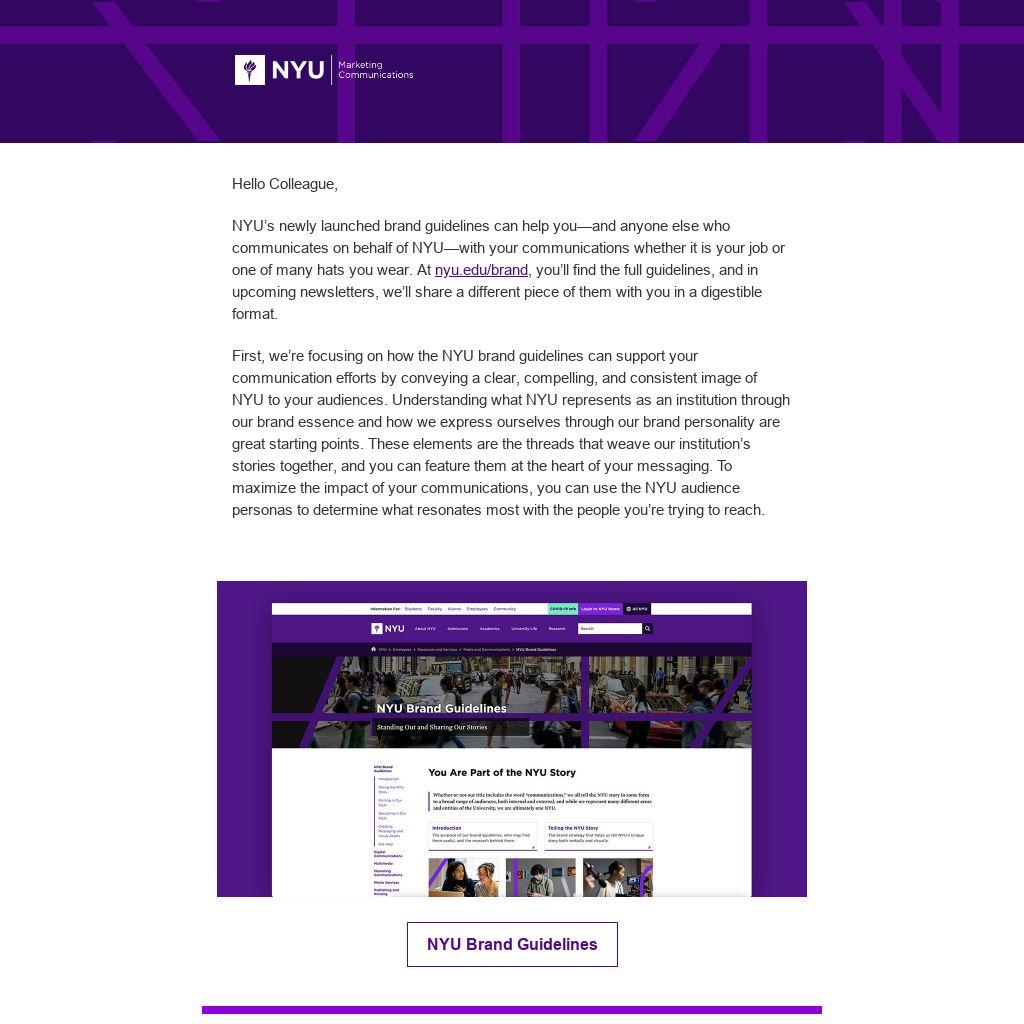 nyu.edu/brand, you’ll find the full guidelines, and in upcoming newsletters, we’ll share a different piece of them with you in a digestible format.