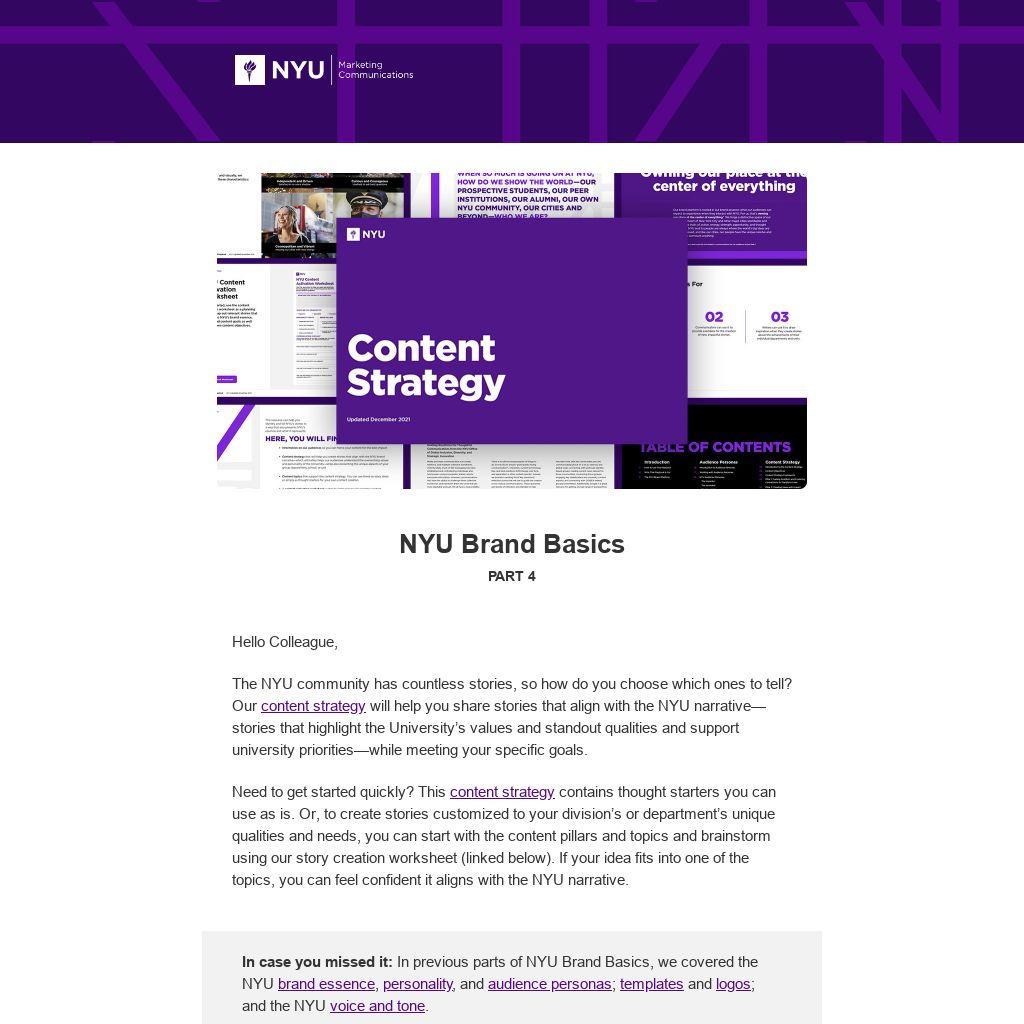 content strategy will help you share stories that align with the NYU narrative—stories that highlight the University’s values and standout qualities and support university priorities—while meeting your specific goals.