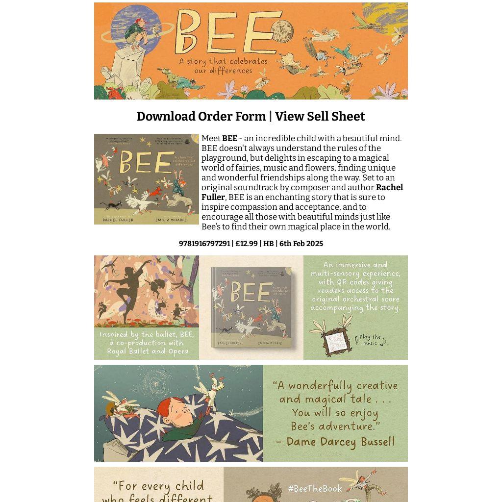 Meet BEE - an incredible child with a beautiful mind. BEE doesn't always understand the rules of the playground, but delights in escaping to a magical world of fairies, music and flowers, finding unique and wonderful friendships along the way. Set to an original soundtrack by composer and author Rachel Fuller, BEE is an enchanting story that is sure to inspire compassion and acceptance, and to encourage all those with beautiful minds just like Bee’s to find their own magical place in the world.