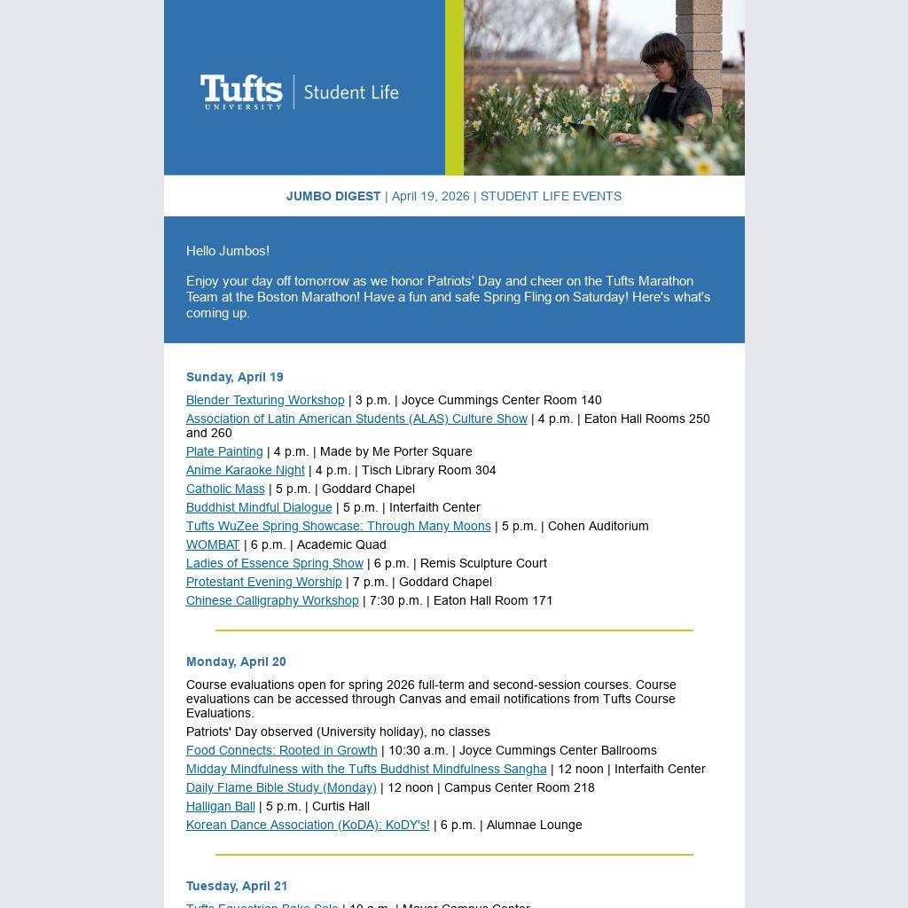 Enjoy your day off tomorrow as we honor Patriots' Day and cheer on the Tufts Marathon Team at the Boston Marathon! Have a fun and safe Spring Fling on Saturday! Here's what's coming up.