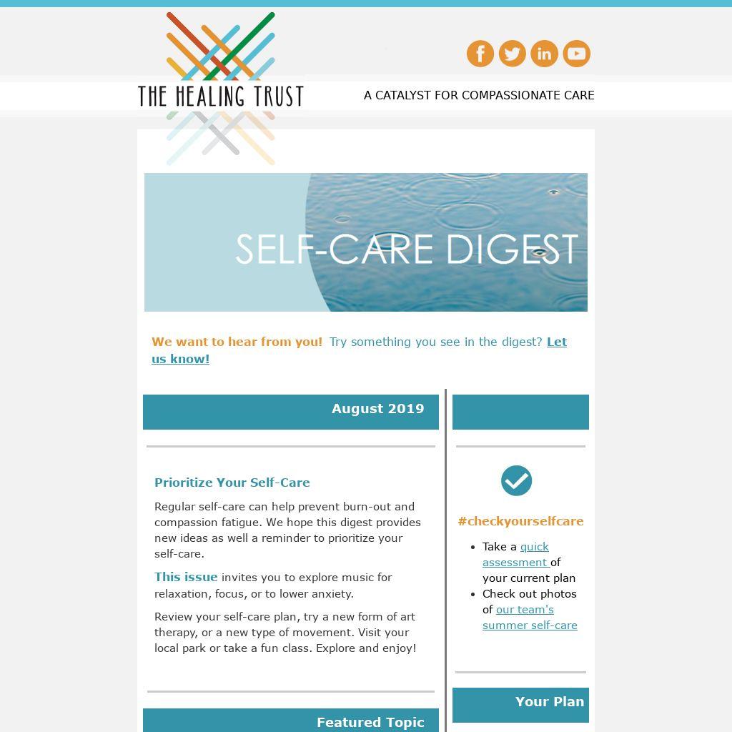 Regular self-care can help prevent burn-out and compassion fatigue. We hope this digest provides new ideas as well a reminder to prioritize your self-care.
