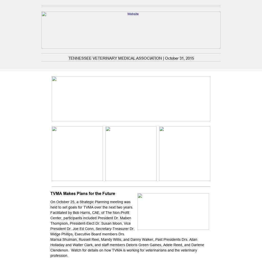 TVMA Makes Plans for the Future On October 25, a Strategic Planning meeting was held to set goals for TVMA over the next two years. Facilitated by Bob Harris, CAE, of The Non-Profit Center, participants included President Dr. Maben Thompson, President-Elect Dr. Susan Moon, Vice President Dr. Joe Ed Conn, Secretary-Treasurer Dr. Midge Phillips, Executive Board members Drs. Marisa Shulman, Russell Reel, Mandy Willis, and Danny Walker, Past Presidents Drs. Allan Holladay and Walter Clark, and staff members Deloris Green Gaines, Adele Reed, and Darlene Clendenon. Watch for details on how TVMA is working for veterinarians and the veterinary profession.