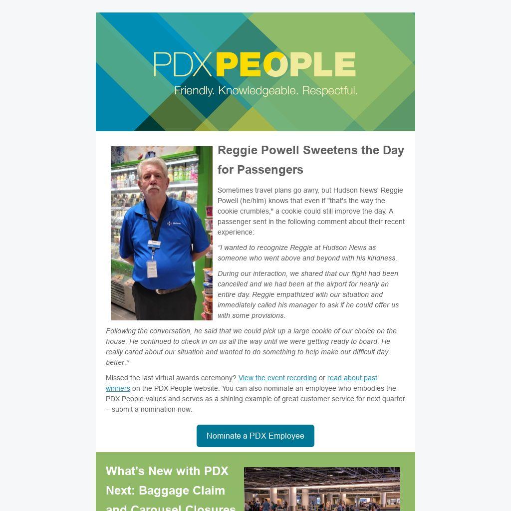 Missed the last virtual awards ceremony? View the event recording or read about past winners on the PDX People website. You can also nominate an employee who embodies the PDX People values and serves as a shining example of great customer service for next quarter – submit a nomination now.