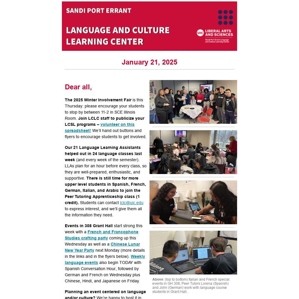 The 2025 Winter Involvement Fair is this Thursday: please encourage your students to stop by between 11-2 in SCE Illinois Room. Join LCLC staff to publicize your LCSL programs – volunteer on this spreadsheet! We’ll hand out buttons and flyers to encourage students to get involved.